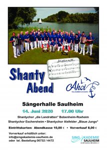 Am 14. Juni 2020 werden der Shanty-Chor Eschersheim, der Shanty-Chor Alsfelder Blaue Jungs sowie "die Landratten" gemeinsam einen Shanty-Abend in der Sängerhalle in Saulheim veranstalten.