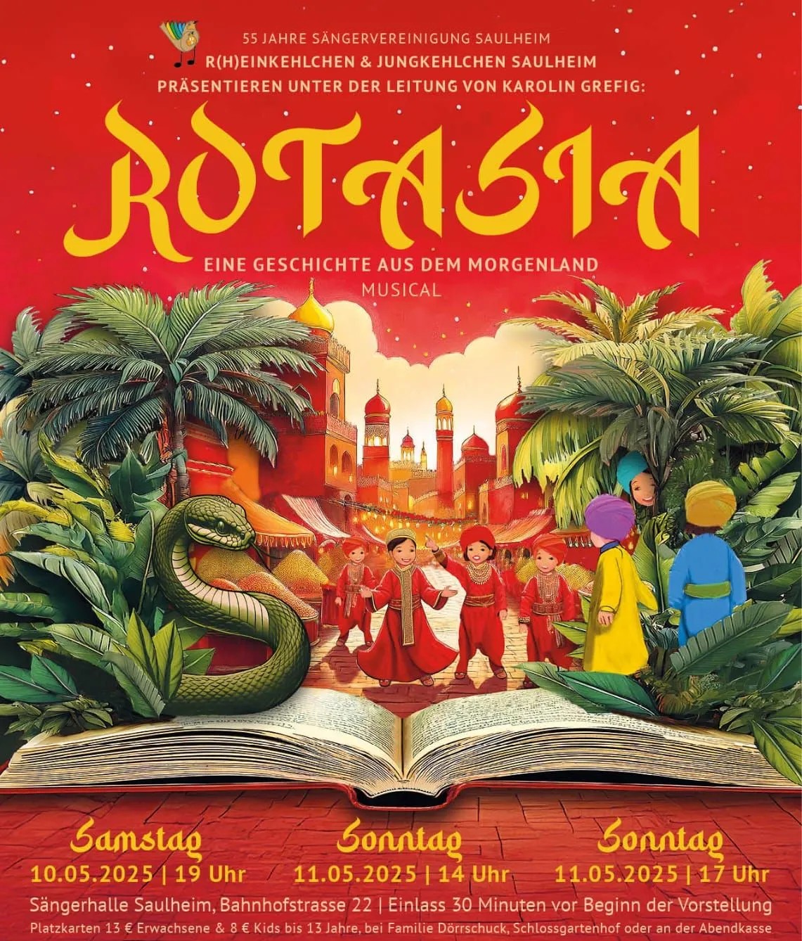Bereits zum dritten Mal wagen sich die 66 Jung- und R(h)einkehlchen der Sängervereinigung Saulheim im Mai 2025 an ein Mammutprojekt, dem Musical „ROTASIA“ aus der Feder von Sandra Engelhardt und Martin Maria Schulte. Das opulent gestaltete Werk aus 1001 Nacht verlangt mit 66 Einzelrollen, sich neben dem Singen auf der Bühne schauspielerisch zu präsentieren sowie zu tanzen. In dieser einmaligen Situation erhält jeder die Chance, über sich selbst hinaus zu wachsen und etwas für sein eigenes Leben zu lernen.
